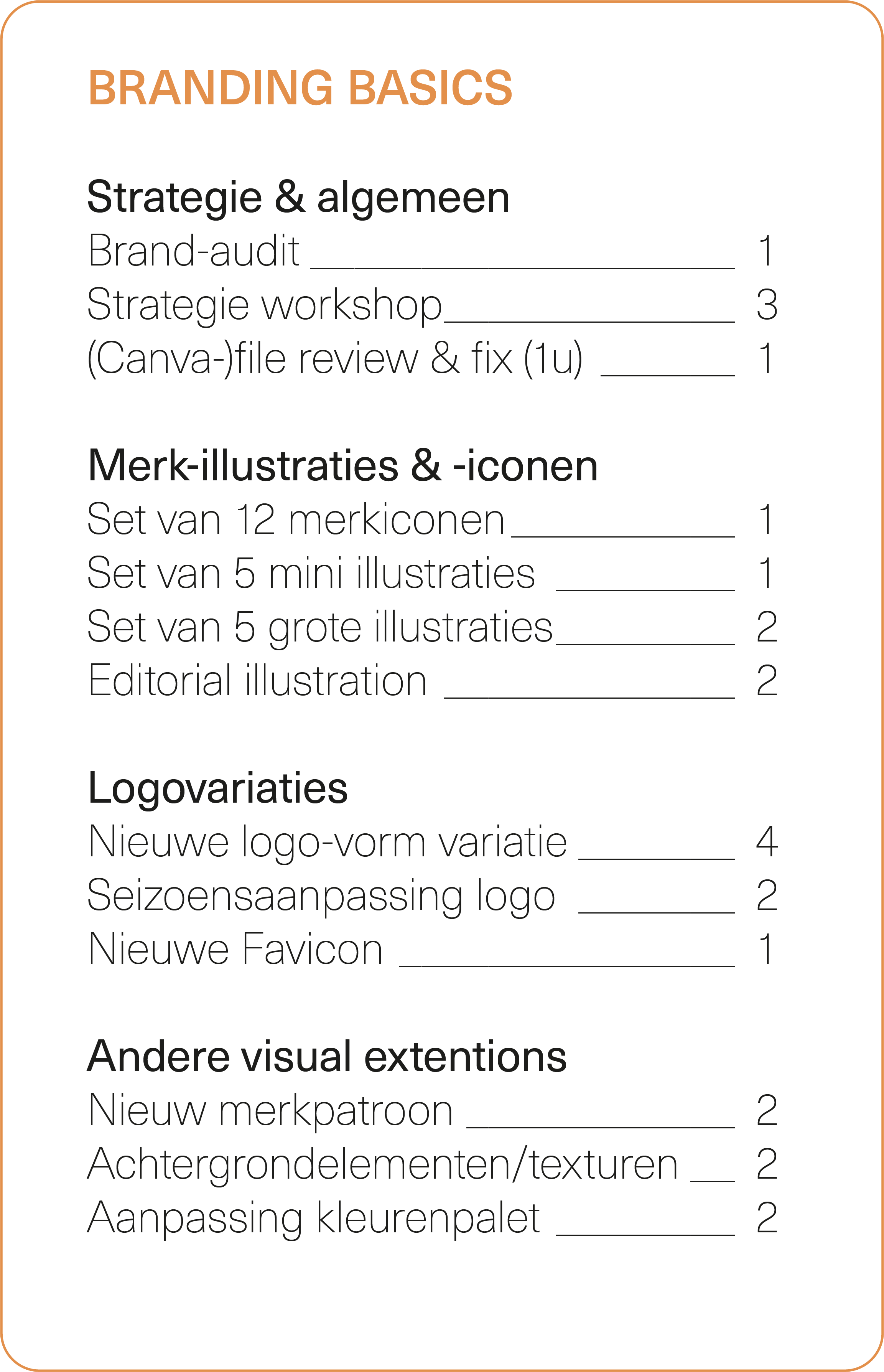 Natuurlijk bepaal jij zelf waar jouw merk het meeste nood aan heeft. Check daarom dit helder creditoverzicht (hello structuur!).